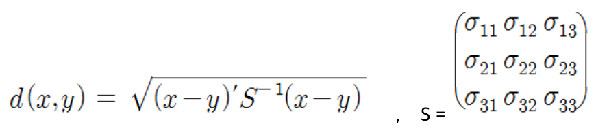 - 두 벡터 사이의 거리를 산포를 의미하는 표본 공분산으로 나눠주어야 하며 그룹에 대한 사전 지식 없이는 표본 공분산을 계산할 수 없으므로 사용하기 어렵다 ★